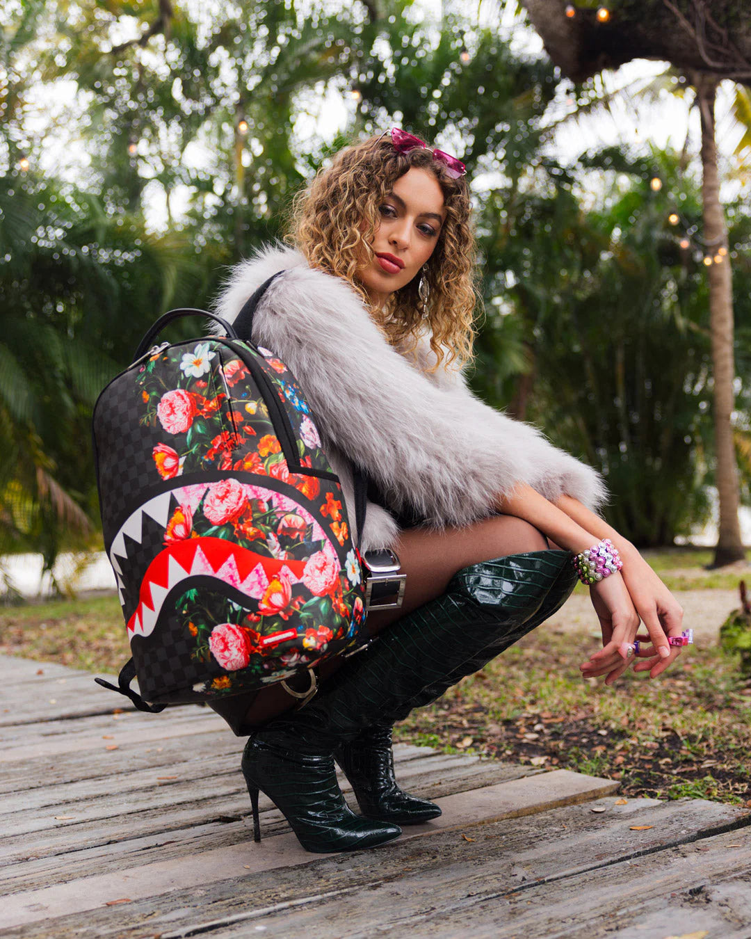 Dimensions: 18" x 6" x 11.5" • Front zipper pocket • Side pockets • Zippered Stash pocket • Separate velour sunglass compartment • Ergonomic mesh back padding • Adjustable Straps for custom sizing • Gold zippers with metal hardware • Metal "Sprayground Authentic" badge • Slide through back sleeve connects to carry-on luggage to free your hands