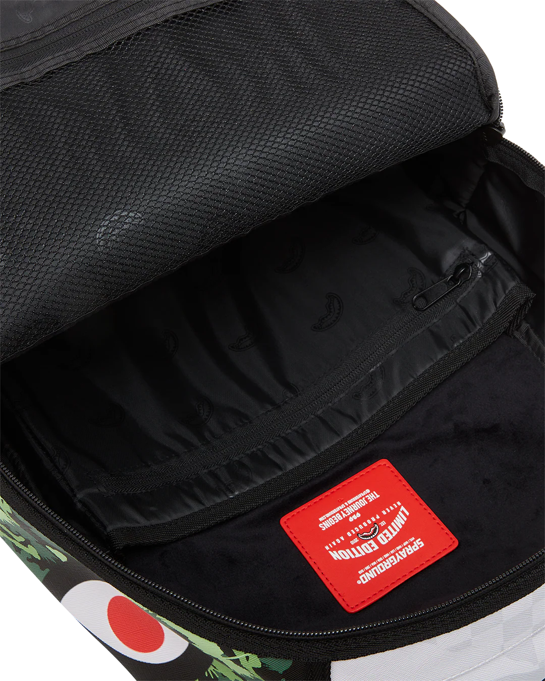 Dimensions: 18" x 6" x 11.5" • Front zipper pocket • Side pockets • Zippered Stash pocket • Separate velour sunglass compartment • Ergonomic mesh back padding • Adjustable Straps for custom sizing • Gold zippers with metal hardware • Metal "Sprayground Authentic" badge • Slide through back sleeve connects to carry-on luggage to free your hands