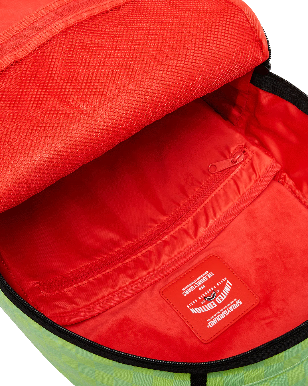 Dimensions: 18" x 6" x 11.5" • Front zipper pocket • Side pockets • Zippered Stash pocket • Separate velour sunglass compartment • Ergonomic mesh back padding • Adjustable Straps for custom sizing • Gold zippers with metal hardware • Metal "Sprayground Authentic" badge • Slide through back sleeve connects to carry-on luggage to free your hands
